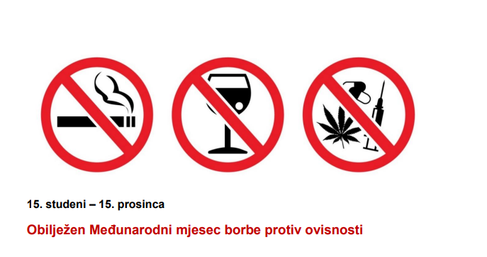 Međunarodni mjesec borbe protiv ovisnosti obilježava se svake godine u razdoblju 15. studenog do 15. prosinca s ciljem senzibilizacije javnosti o štetnim posljedice svih ovisnosti i borbe cjelokupnog društva sa ovim ozbiljnim problemom suvremenog doba. Cilj obilježavanja je upozoriti javnost na problem zlouporabe svih sredstava ovisnosti te putem šire društvene akcije promicati zdrav način života. Pri suzbijanju ovisnosti važnu ulogu imaju preventivne aktivnosti, u sklopu kojih je nužno provoditi edukaciju o štetnosti sredstava ovisnosti od najranije dobi i na svim razinama društva. Zlouporaba alkohola i droga jedan je od vodećih javnozdravstvenih problema današnjice.